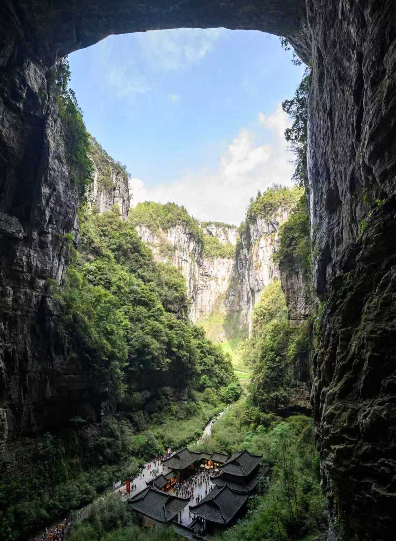 站在天生三桥的天坑底部,马来西亚川渝总商会副会长刘素华仰头望
