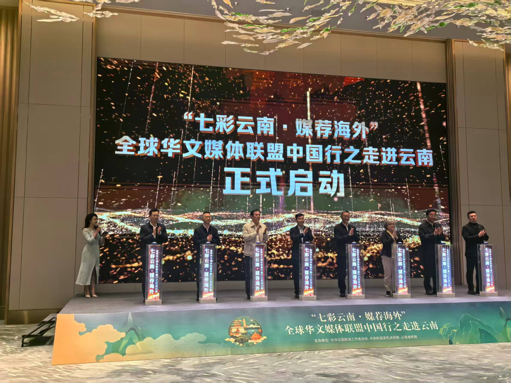 4月23日晚,“七彩云南·媒荐海外”全球华文媒体联盟中国行之走进云南活动在昆明启动。陆希成摄 本次活动由中华全国新闻工作者协会、中央和国家机关侨联、云南省归国华侨联合会主办。活动期间,华文媒体代表将围绕云南历史文化、生态文明、经济社会发展等主题实地探访,并通过座谈交流、对话互访等,向海外讲述美丽云南、开放云南、活力云南。