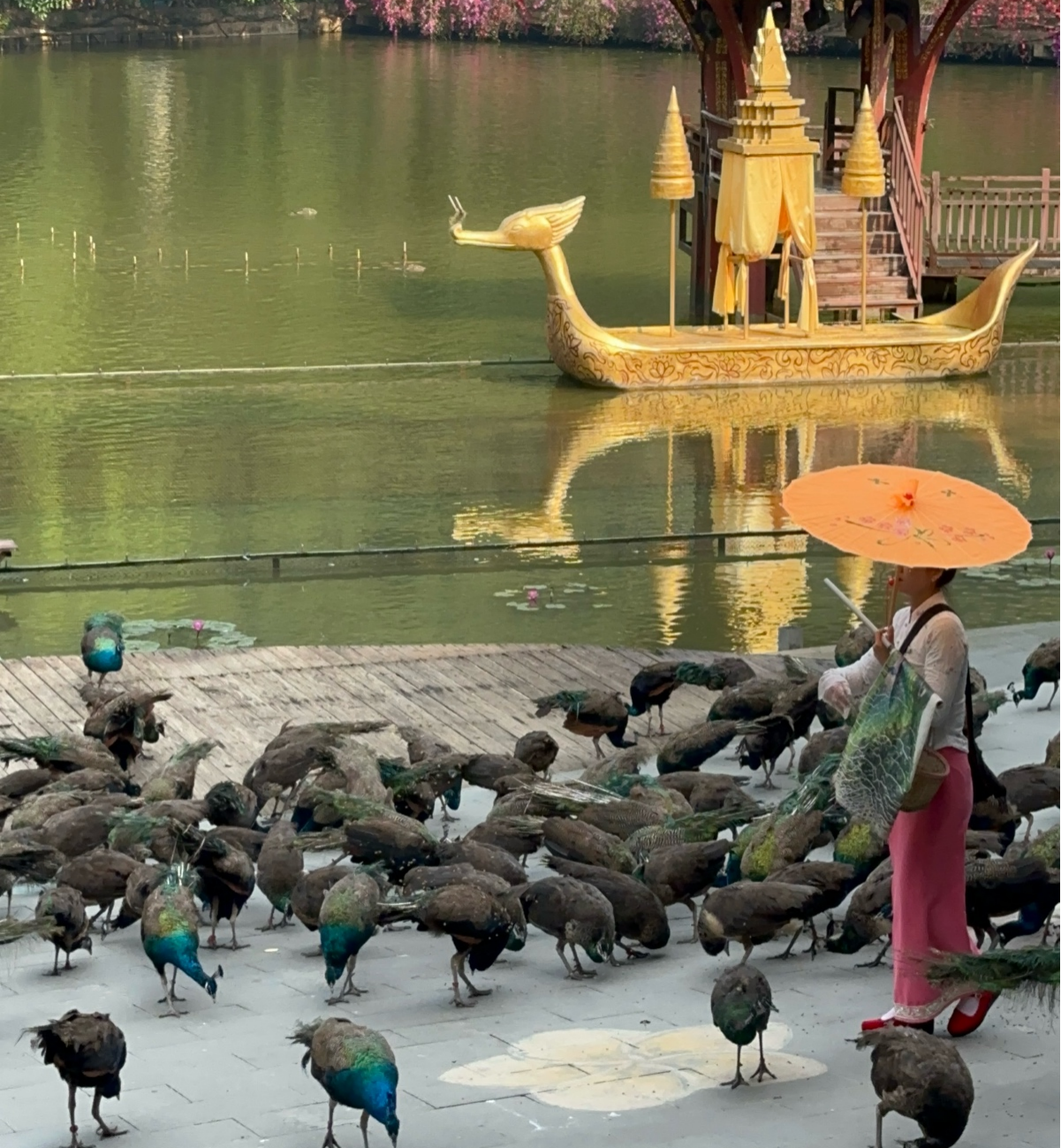 这座始建于1995年、1999年正式开放的公园,占地27025.55亩,但实际开发的游览面积仅810亩,超过97%的区域保持原始状态,是北回归线以南保存较为完好的一片热带雨林。 走进公园,最让记者们挪不开眼的,是“孔雀放飞”实景演艺。每天数场,数百只绿孔雀从对面山腰振翅飞过湖面,场面震撼。